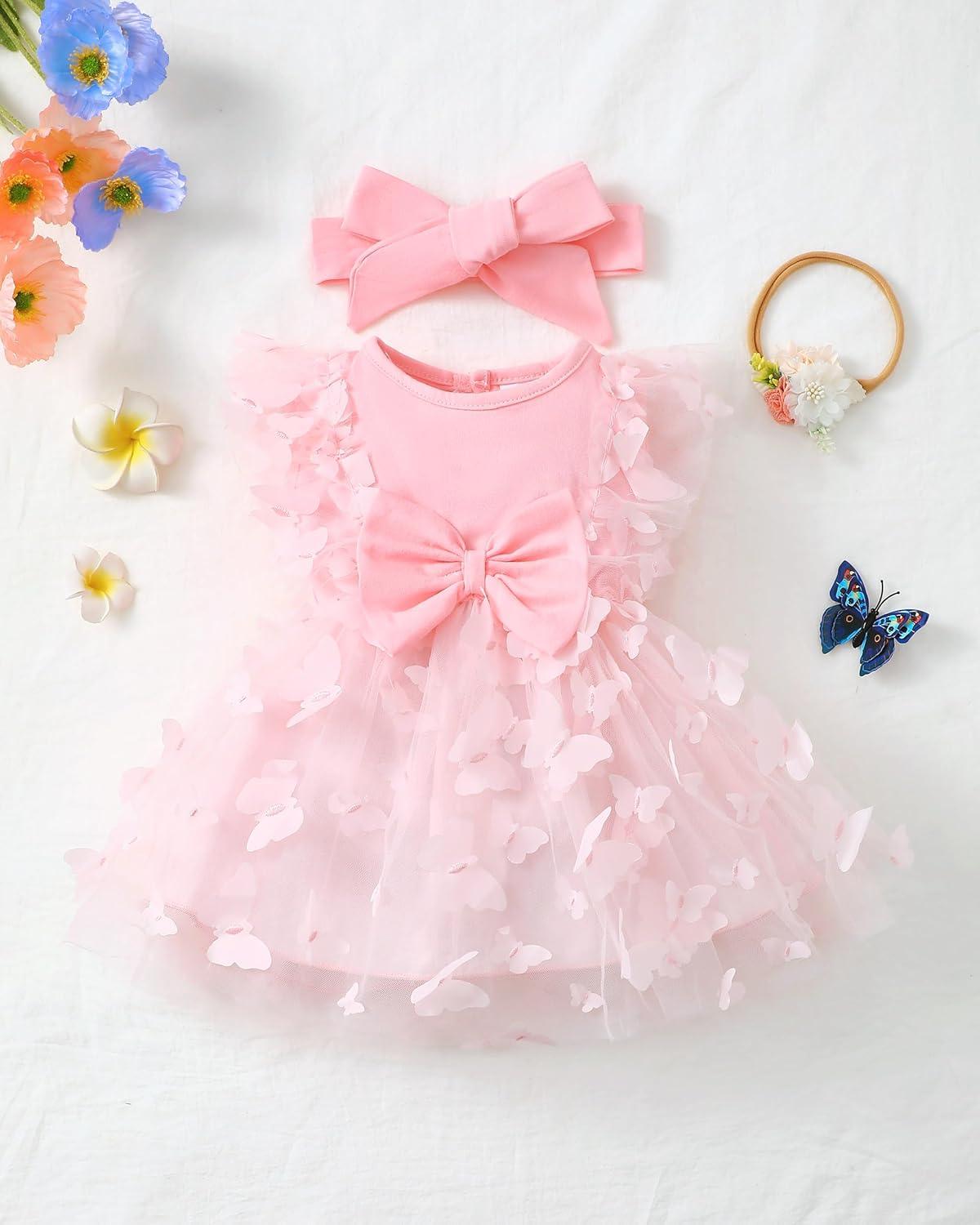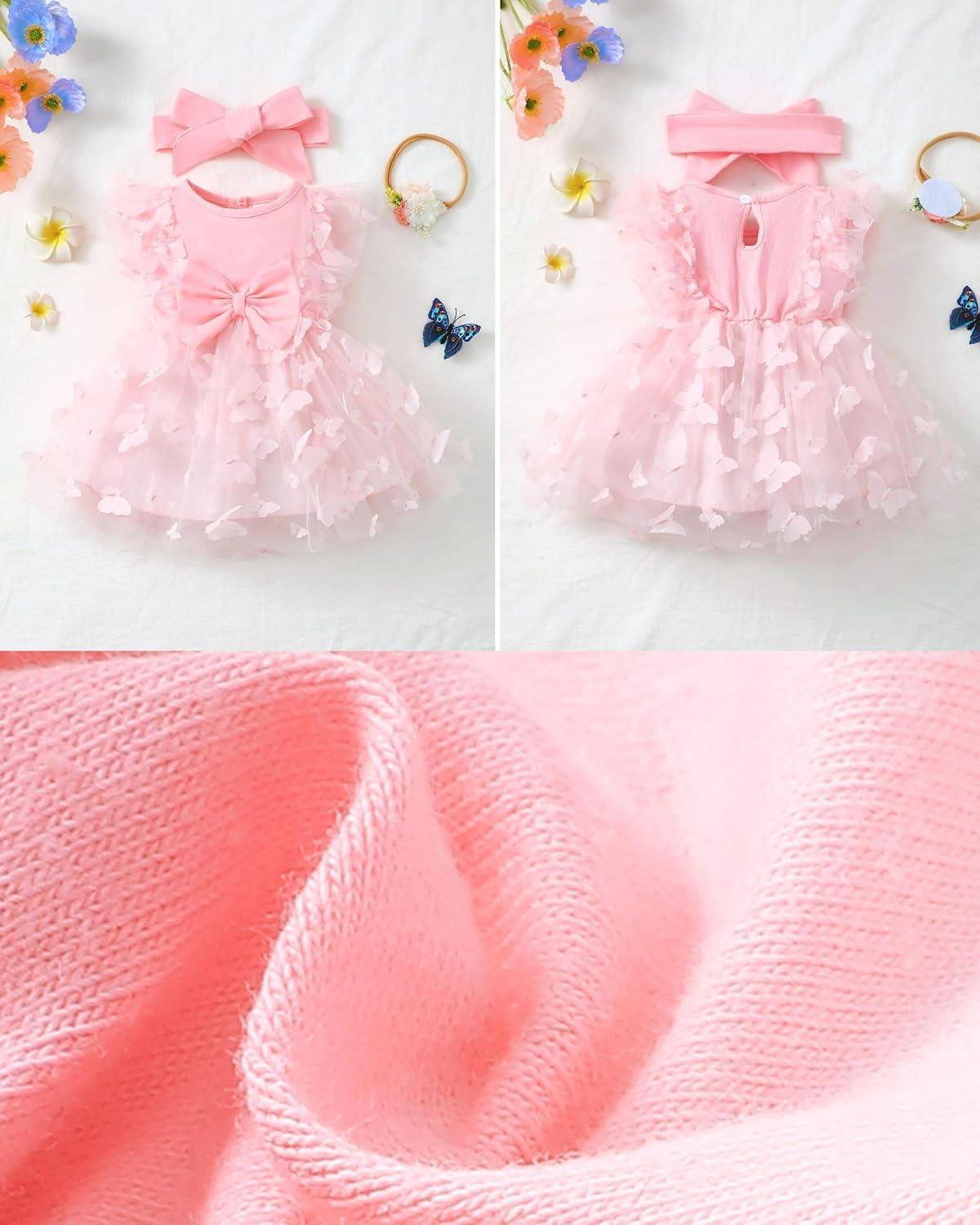 Renotemy Baby Girl Flower Dress Summer, Tutu Tulle Boho Princess Wedding Birthday Party Dresses for Infant Girls 0-18 Months(Pink Butterfly)