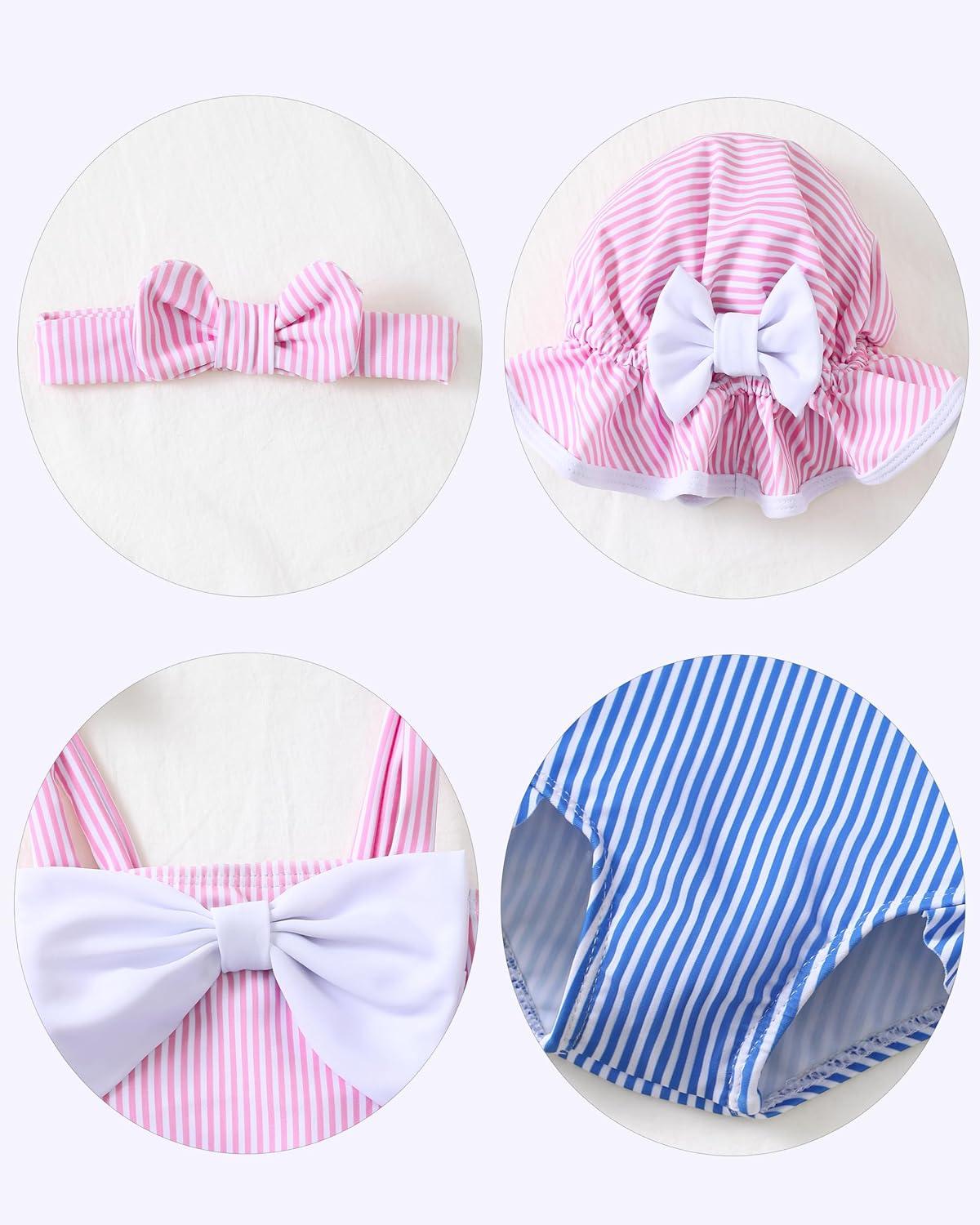 Renotemy Baby Girl Swimsuit Infant Bathing Suit Swimwear Sleeveless Bikini Tankini Toddler Girl One-Piece Swimsuit with Hat(Pink Strip)