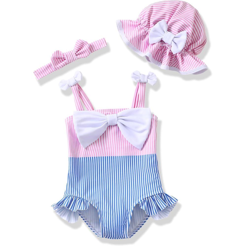 imageRenotemy Baby Girl Swimsuit Infant Bathing Suit Swimwear Sleeveless Bikini Tankini Toddler Girl OnePiece Swimsuit with HatPink Strip