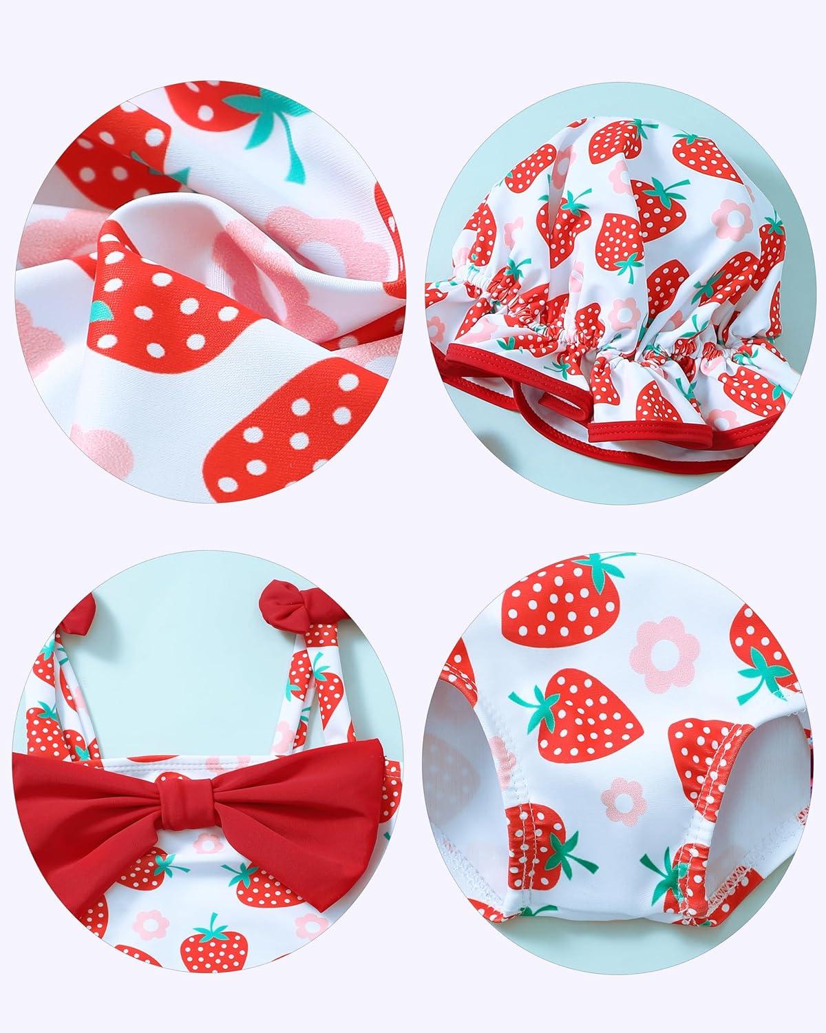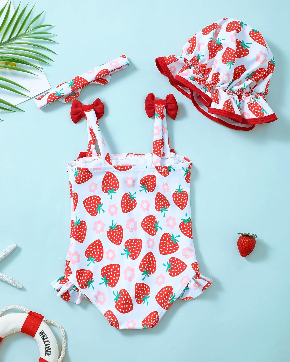 Renotemy Baby Girl Swimsuit Infant Bathing Suit Swimwear Sleeveless Bikini Tankini Toddler Girl One-Piece Swimsuit with Hat(Strawberry)