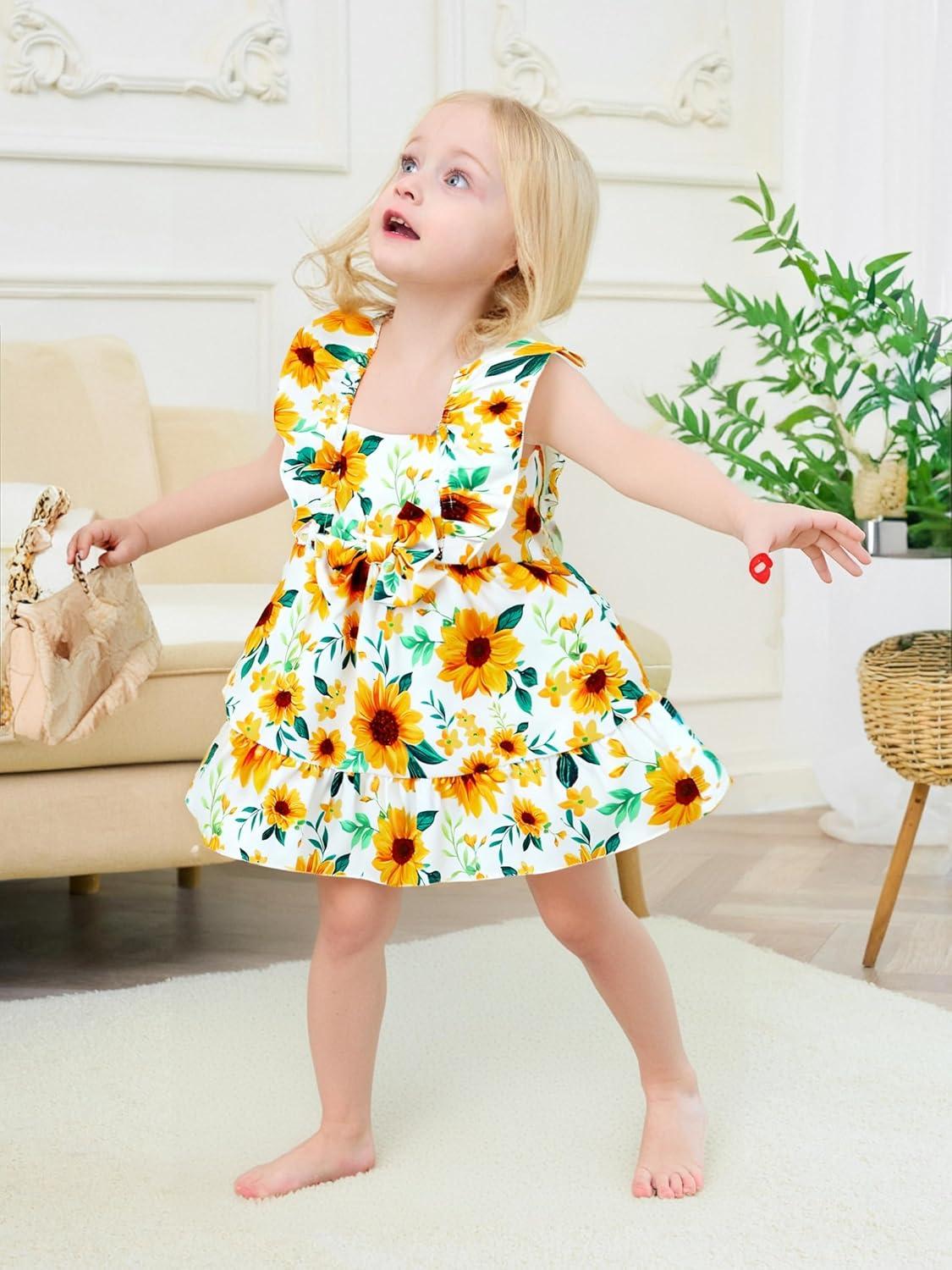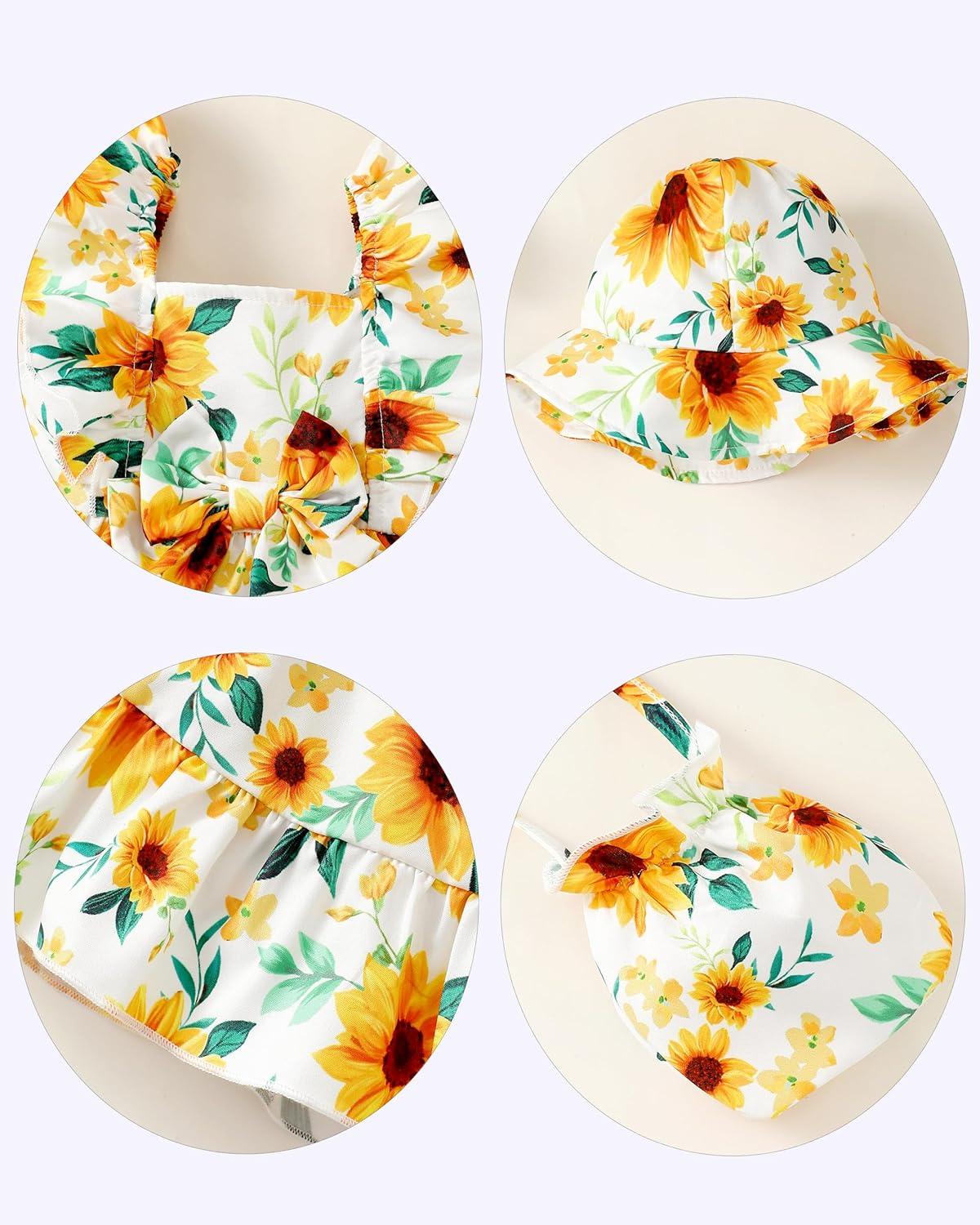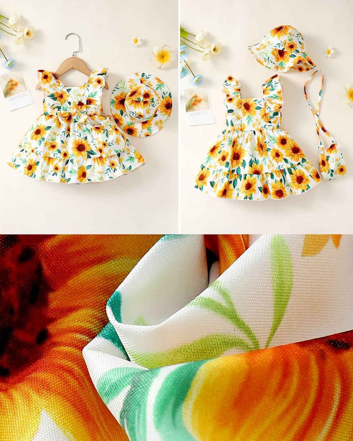 Renotemy Newborn Infant Baby Girl Dresses Summer Outfits Boho Casual Sundress Gifts Toddler Clothes for Girl with Hat and Bag(Yellow Sunflower)