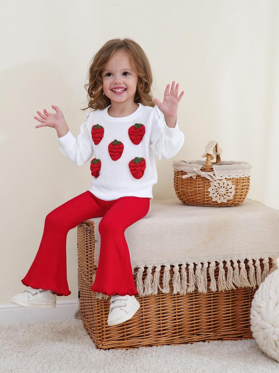 Renotemy Toddler Baby Girl Clothes Fall Winter Outfits, Ruffle Sleeve Crew Neck Sweatshirts Flare Pants Set 12Months-4 Year(White Strawberry)